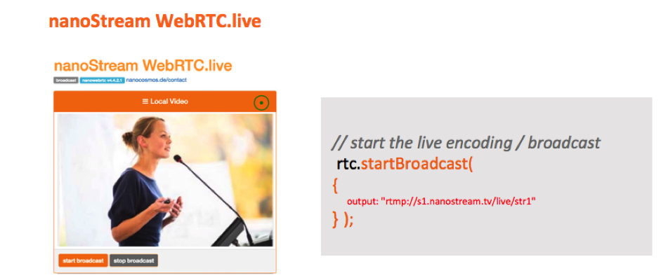 Finally, combining nanoStream WebRTC.live with nanostream Cloud and nanoStream H5Live Player is simply a click on “start broadcast” and your stream will be available around the world in 1 second!