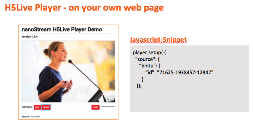 3 Embed nanoStream Webcaster as a live encoder and nanoStream H5Live Player in your own webpage. Learn more here.