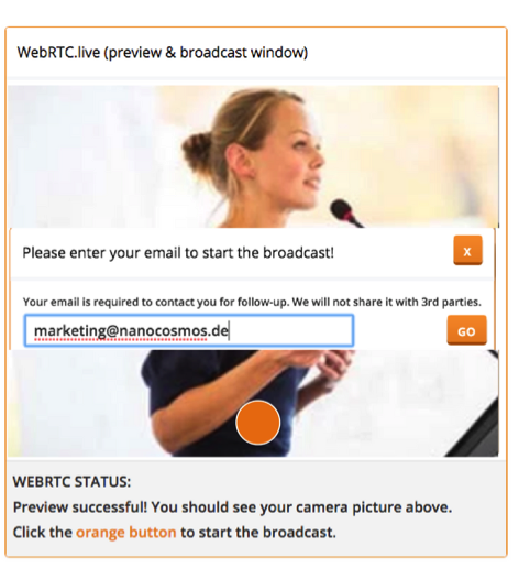 Click on the orange button to start the broadcast. You will need to provide your email first.