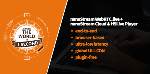 As we learned in this article, nanoStream Webcaster (formerly known as WebRTC.live) is a powerful live encoding tool for browser-based interactive live streaming. Combining it with the unique nanoStream Cloud with integrated nanoStream H5Live Player creates an end-to-end workflow for scalable ultra-low-latency live streams worldwide.
