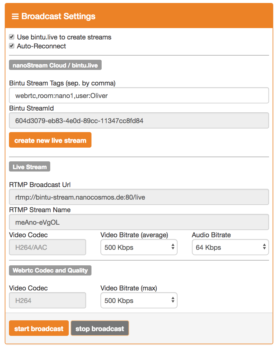The Webcaster configuration is automatically set to H264 video with 500 kbits/s. Audio is sent with the Opus audio codec and will be transcoded automatically to AAC for live distribution with nanoStream Cloud.