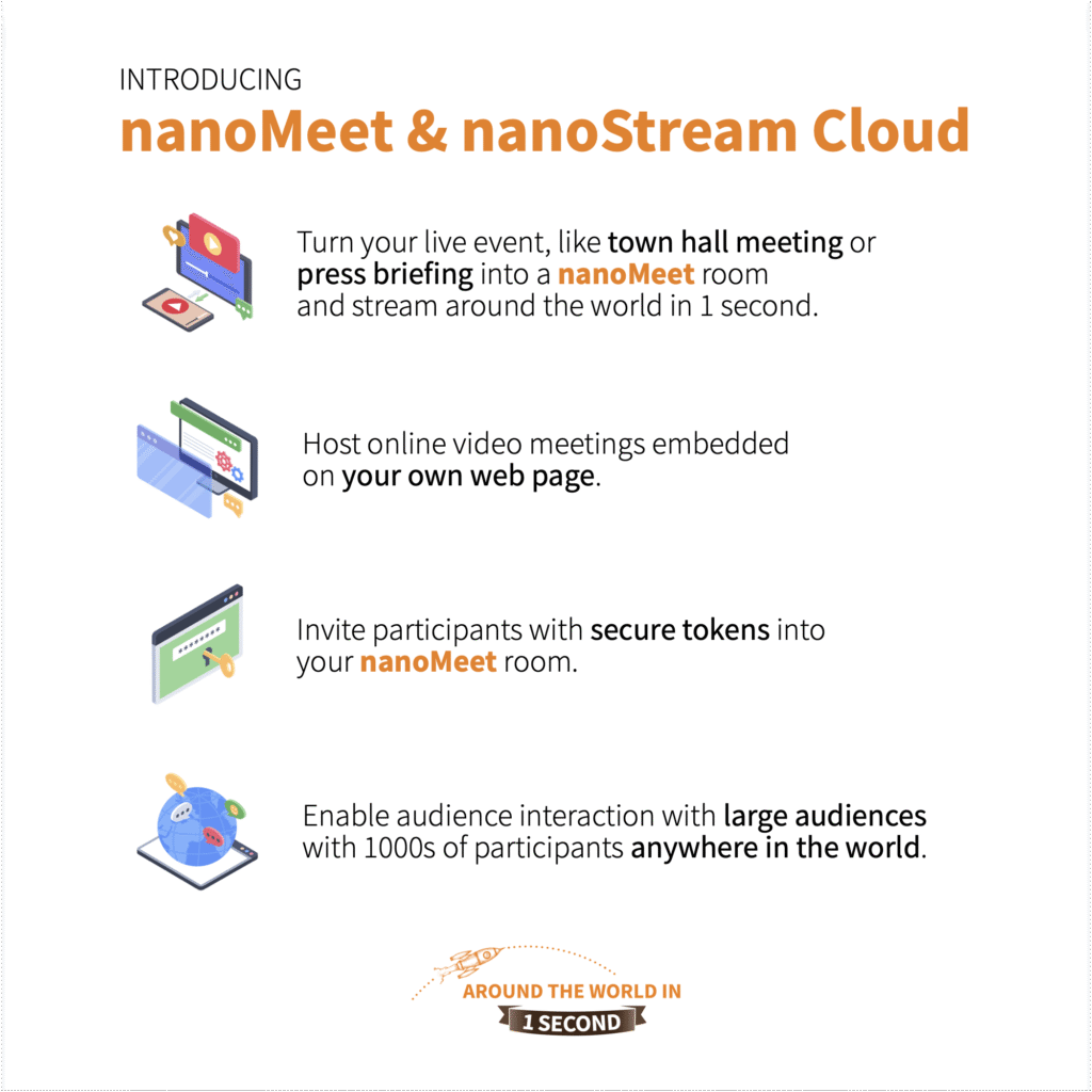 Presseinformation / Press Release Berlin, April 2021 Die Berliner Firma nanocosmos GmbH bringt ein neues Streaming-Produkt auf den Markt. nanoMeet ist eine browserbasierte Lösung für live Video und virtuelle Zusammenarbeit. Als Teil der nanoStream Cloud, einer B2B-Gesamtlösung für interaktives Live-Video-Streaming, ist sie ideal für Unternehmen und jeden, der mit großen Zuschauerzahlen in Echtzeit interagieren will. nanoMeet kann dem Corporate Design der Unternehmensmarke angepasst und von der lokalen Webseite des Veranstalters an hohe Zuschauerzahlen übertragen werden. Letzteres ist vor allem aufgrund der Corona-Situation und der geltenden Restriktionen ein wichtiges Thema, da viele Organisationen die Interaktion mit ihren Zielgruppen verstärken wollen. Dank der Anbindung an die nanoStream Cloud-Lösung ist die Übertragung von einem Punkt an viele und somit die Interaktion mit Tausenden möglich. Ein interessanter Aspekt ist die Möglichkeit, sogenannte Watch-Partys zu veranstalten, bei denen sich eine Gruppe virtuell trifft, um gemeinsam einen Stream anzusehen. nanoMeet wird somit zur Lösung für sogenannte ‘Hybridevents’, ein Phänomen, das die Grenze zwischen virtuellem und in Person erlebtem Event aufhebt und während der Pandemie verstärkt gefragt ist: der Wunsch sich in Person zu treffen vereint sich mit der Flexibilität, Inhalte virtuell mit einem breiteren Publikum zu teilen. Hierbei müssen Zielgruppen häufig unabhängig von ihrer geographischen Lage erreicht werden. Teilnehmer werden über einen sicheren, temporär gültigen Token eingeladen. Dies bietet sich für Interaktionen mit großen Zuschauerzahlen an und gestaltet den Zugang für Zuschauer extrem einfach. Oliver Lietz, CEO und Gründer von nanocosmos: “Wir freuen sehr, nanoMeet anbieten zu können. Mit den vielseitigen Anwendungsbereichen für Live-Events sowie Funktionen fürs individuelles Branding auf Kundenseite sind wir sicher, für Unternehmen, öffentliche Einrichtungen und für den Eventbereich, besonders jedoch für Plattformanbieter ein neues wichtiges Tool und eine Lösung für viele der aktuellen Herausforderungen anbieten zu können.” nanoMeet bietet vor allem durch die nahtlose Anbindung an die bereits fortschrittlichen Streaming-Technologien von nanocosmos hervorragende Möglichkeiten nicht nur für den privaten, sondern auch für den öffentlichen Sektor. Interaktive Szenarien wie Kundgebungen, Hauptversammlungen, Diskussionen, Webcasts, Pressekonferenzen können nahezu in Echtzeit übertragen werden. Sicherheit hat dabei Priorität und deshalb müssen für nanoMeet temporär begrenzte Tokens verwendet und ein einfacher sicherer Zugang gewährleistet werden. Jenseits von Vorstandssitzungen und Jahreshauptversammlungen kann das neue Angebot von nanocosmos auch für Kulturevents verwendet werden. Sei es für Musik oder Comedy – die Übertragung kann von einem großen Publikum weltweit empfangen und zur Interaktivität genutzt werden. Technische Beschreibung nanoMeet ist eine browserbasierte Live-Video-Plattform für virtuelle Zusammenarbeit. Sie basiert auf der Open Source Software Jitsi Meet und ist Teil der Live-Streaming-Lösung nanoStream Cloud. Online Samples, Code Snippets und Web-API ermöglichen dem Administrator das Branding individuell anzupassen, den Ort des Servers zu wählen (EU, US) und sichere Tokens zu verwalten. Teilnehmer werden mit unterschiedlichen Zugangsrechten eingeladen. Sobald nanoMeet in die Webseite integriert ist, können die Eingeladenen über die zeitlich begrenzten Tokens teilnehmen.  Virtuelle Konferenzen können mit extrem niedriger Latenz gestreamt und dank der Anbindung an die nanoStream Cloud Lösung an ein großes Publikum übertragen werden. Für nanoMeet bzw. nanoStream Cloud gibt es Support rund um die Uhr und Service für alle Zeitzonen und Übertragungsstandorte. Der Serverstandort ist in Deutschland und alle Leistungen entsprechen den Anforderungen der DSGVO. Über nanocosmos nanocosmos ist ein in Berlin ansässiges Unternehmen und führender Cloud-Anbieter einer integrierten Live Streaming-Lösung mit extrem niedrigen Latenzzeiten für kommerzielle Anbieter. nanoStream Cloud kombiniert Software, globale CDN-Services, Live-Player einschließlich ABR und Analytics.