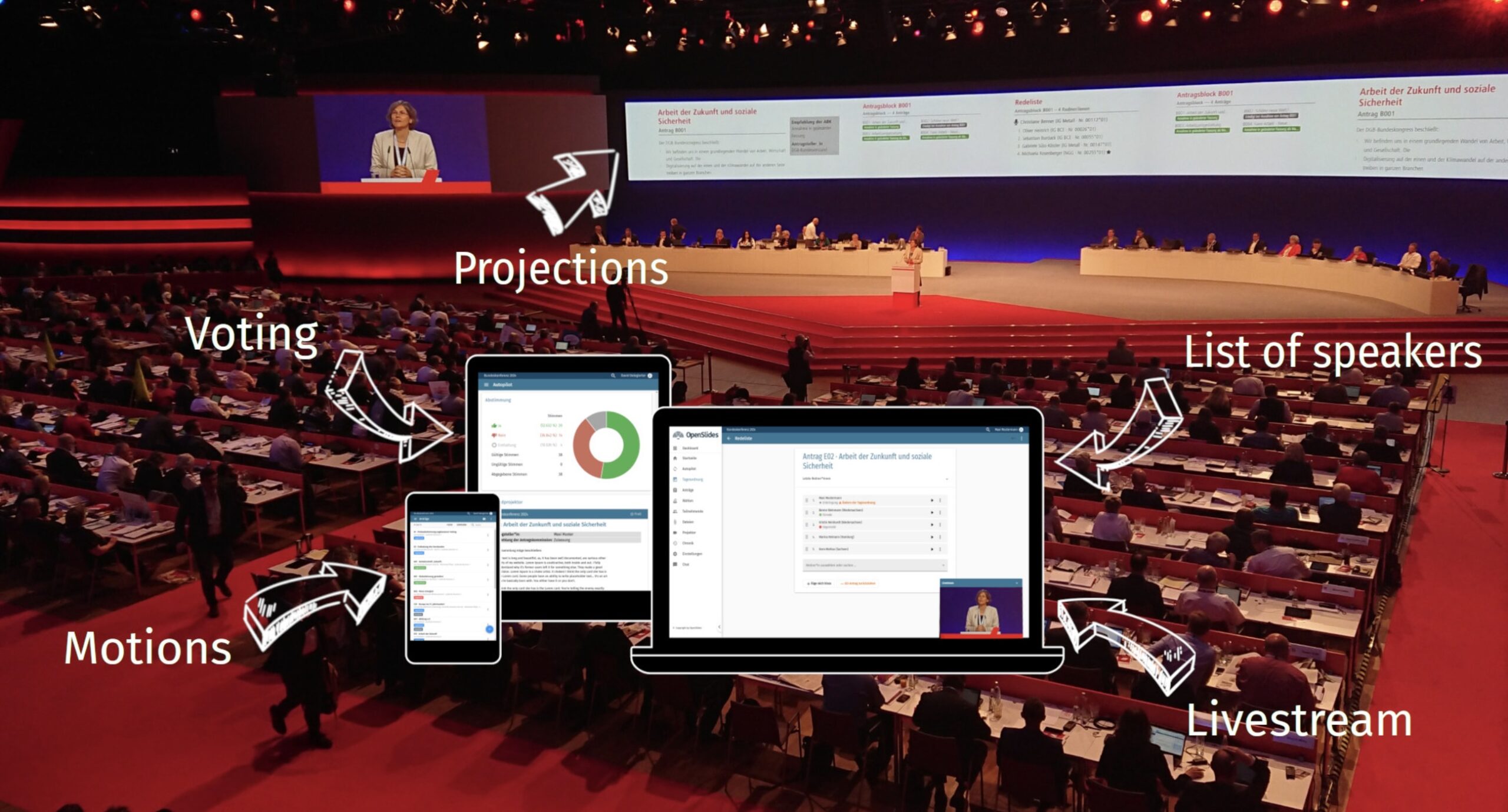 Die digitale Event-Management-Plattform OpenSlides nutzt nanoStream Cloud, um interaktives Livestreaming mit extrem geringer Latenz für das Publikum zu ermöglichen. Dies ist eine hervorragende Möglichkeit, um bei hybriden, virtuellen Meetings und Konferenzen Interaktion via Livestream anzubieten, auf die die Zuschauer in nahezu Echtzeit reagieren können.