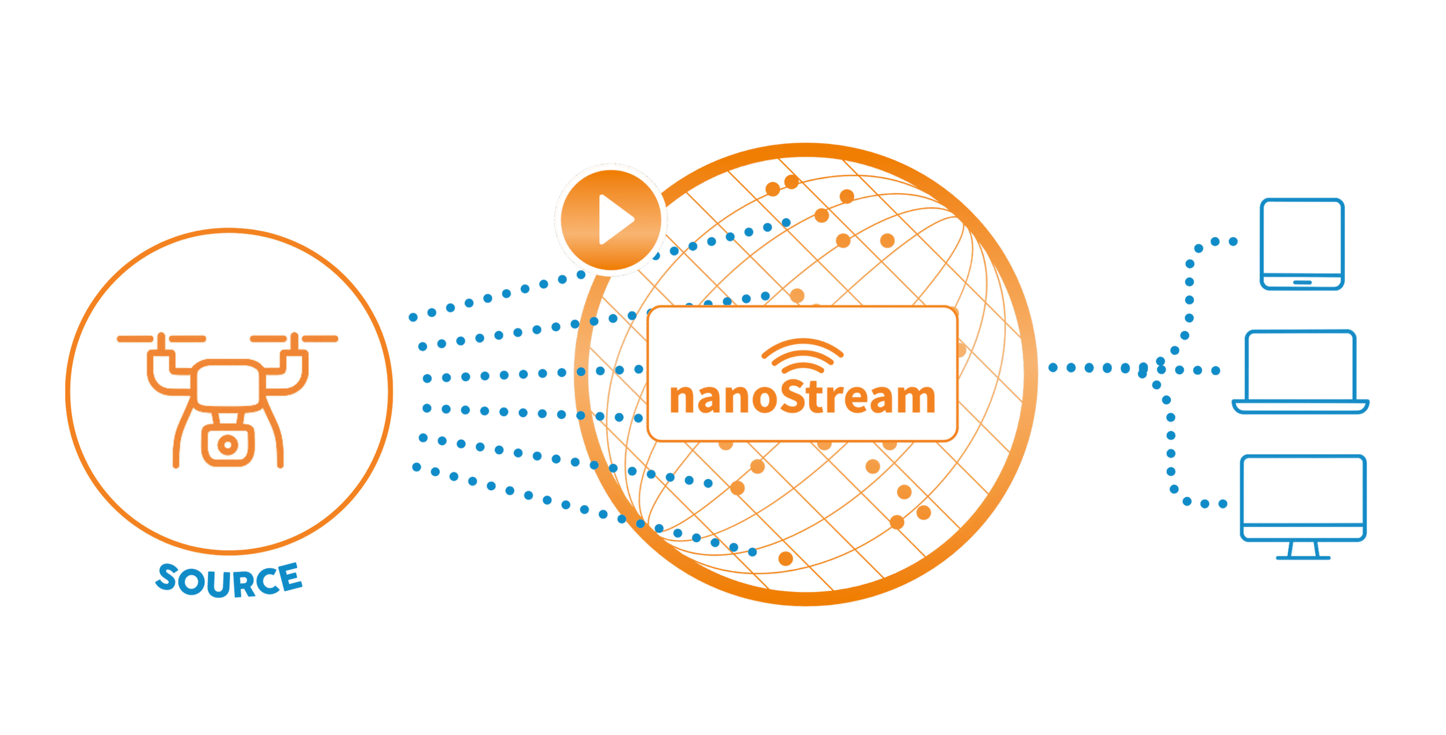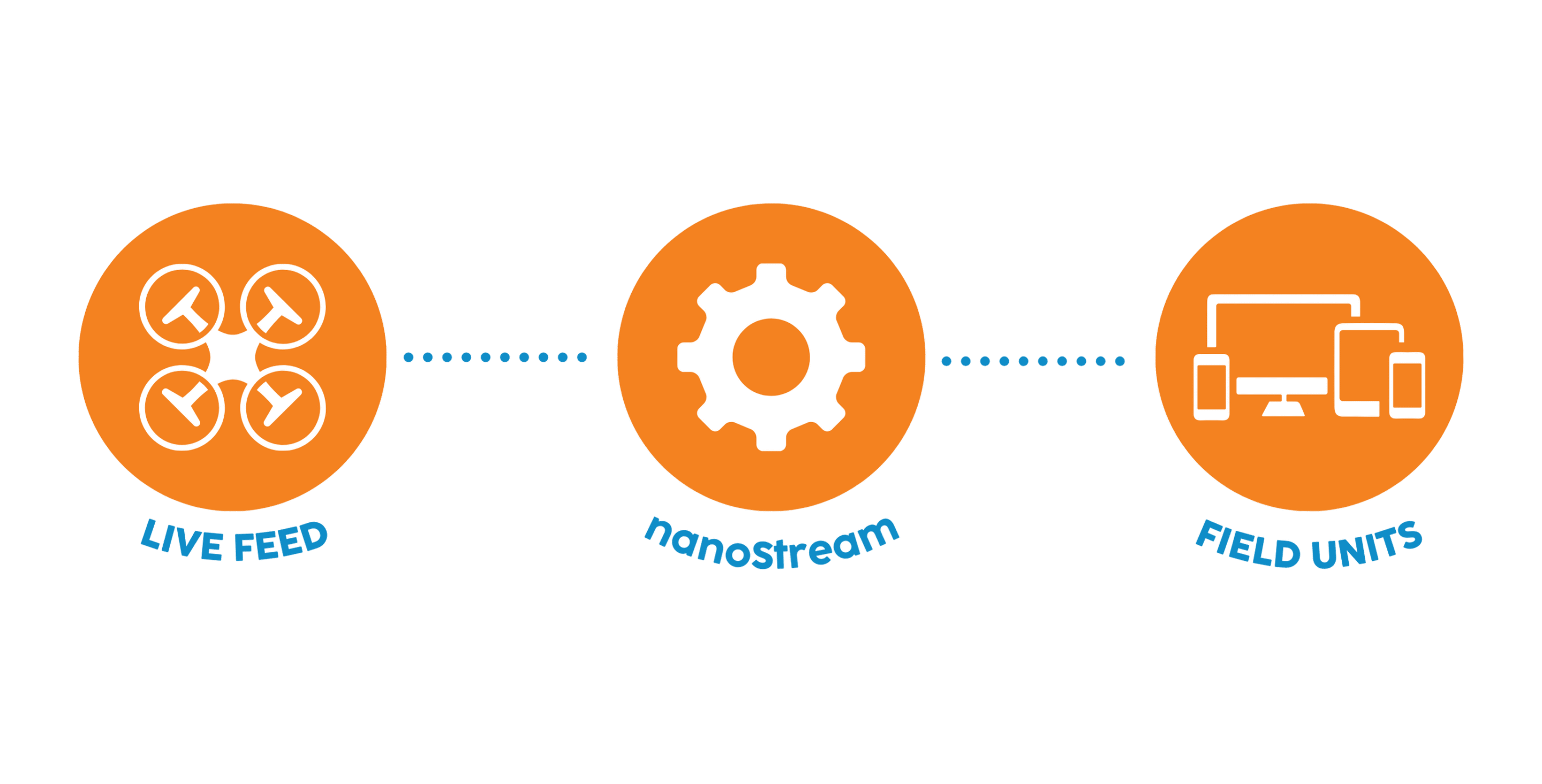 For example, a drone feeds live video to headquarters. With nanoStream, that video is securely shared in real-time with: