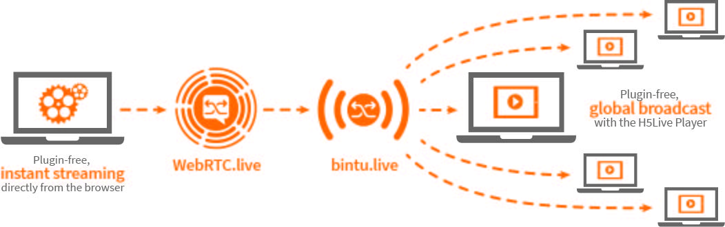 The WebRTC broadcaster sends the live stream to our RTMP servers for further delivery to player applications.