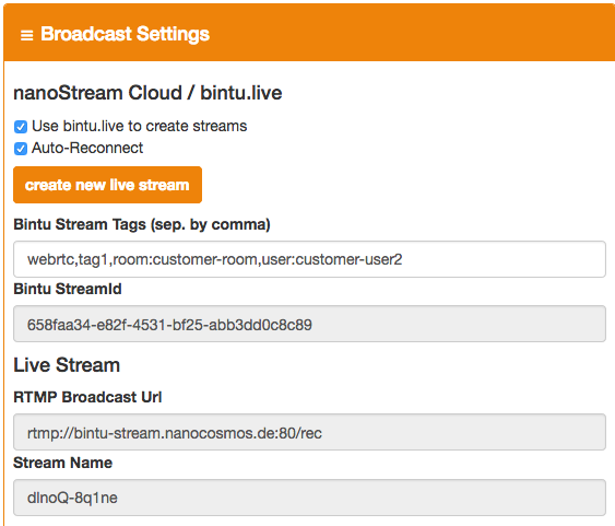 With our nanoStream cloud, the bintu API is called to obtain unique RTMP URLs.