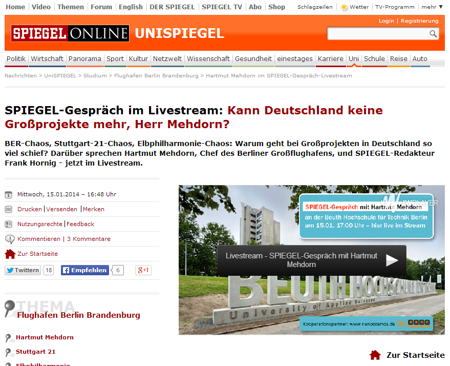 SPIEGEL-Gespräch – live an der Beuth Hochschule mit Hartmut Mehdorn. “Zu teuer, zu komplex? Deutschlands Probleme mit Großprojekten” am Mittwoch, 15. Januar 2014, 17:00 Uhr, Beuth Hochschule für Technik Berlin, Haus Grashof, Ingeborg-Meising-Saal, Luxemburger Straße 10, 13353 Berlin.