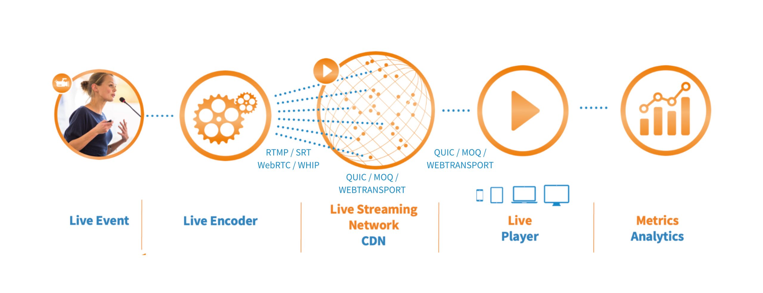 Our comprehensive MoQ strategy integrated it throughout our entire nanoStream platform, from CDN-level origin-edge distribution to last-mile delivery to playback devices. This end-to-end approach ensures that businesses can leverage MoQ’s benefits without needing to understand the underlying complexity. Our platform automatically handles protocol selection, fallback mechanisms, and optimization based on network conditions. And the good thing is, existing workflows do not need any change; a simple player update does it!